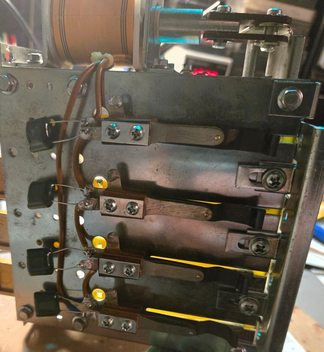 Die "dem Betrachter am nächsten" liegenden Fahnen waren wohl mal verlötet, jedoch nur ganz rechts ist 1 Kabel noch dran. Zwischen den Kontakten der mittleren Lage existieren die sichtbaren Verdrahtungen mit Kondensatoren oder Sperrdioden? Leider keine Ahnung, wie ich sowas teste... -