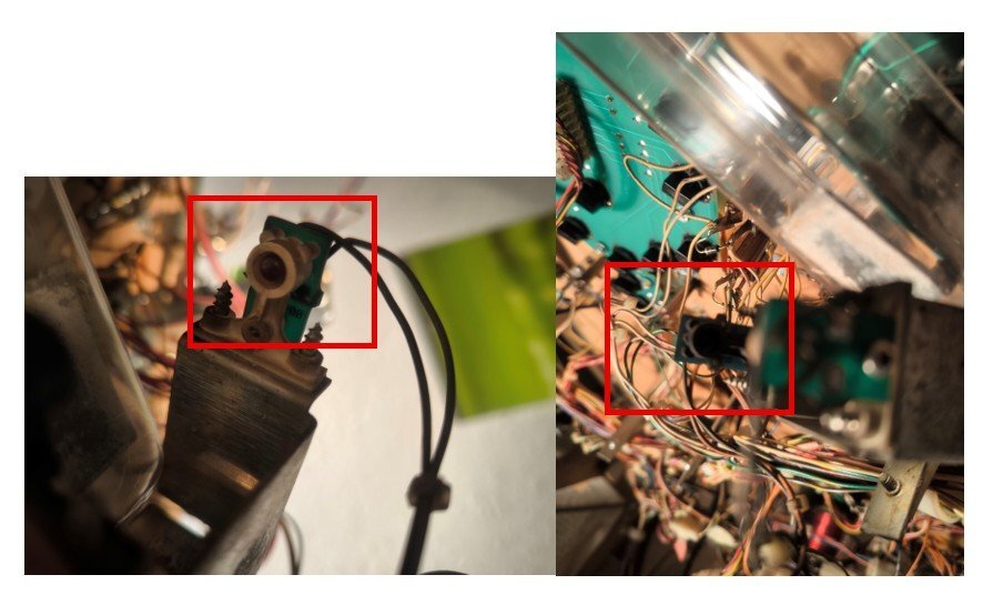 Hallo André Vielen Dank für dein Mail und Erklärungen. Den Schaltertest habe ich gemacht. Wenn ich auf den Schalter 24 springe, erscheint auf der linken Seite bei den senkrechten 8 Punkten um den zweit- resp. drittuntersten (je nach dem ob ich den Schalter von oben + oder unten - ansteuere) Punk ein Kästchen (siehe Bild anbei). Demzufolge würde ich sagen, der Schalter ist aktiv. Die Sicherungen F114/F115 habe ich nochmals gemessen und diese sind ok. Testpunkt 8 habe ich mit 16.74 V gemessen und Testpunkt 3 mit 11.94 V. Anbei auch ein Foto vom CPU. Sieht für mich nicht so aus, als wären Leiterbahnen angegriffen - ICs weis ich leider nicht, was das ist. Bezüglich deinem edit zu den Optos/Lichtschranken: Im Handbuch finde ich so einiges zu Optos... Unter dem Spielfeld konnte ich aber eine offensichtliche Lichtschranke finden. Ich habe diese etwas gelöst und ebenfalls ein Foto gemacht. Was sollte denn passieren, wenn ich meine Finger zwischen die Lichtschranke halte? Sollte ich ein Licht auf meinem Finger sehen oder sollten da ein Lämpchen/Laser zu sehen sein? - Heute