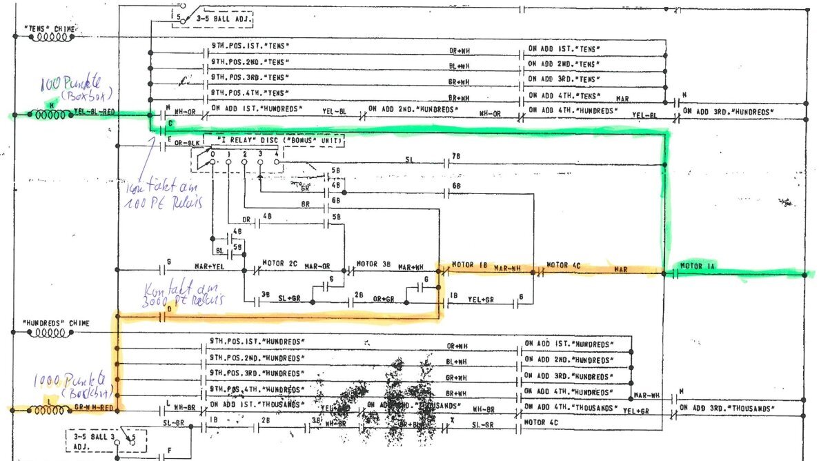 So, nun mal was zum Testen: Beiden (500 & 3000 Pt) gemeinsam ist, das der Impuls über den Scoemotorkontakt 1A gepulst wird! Das ist der unterste Kontaktsatz am Kontaktstapel 1 des Scoremotors. Das wäre mein erster Kandidat für diesen Fehler. Bitte da den Kontakt richtig säubern und justieren! Ich nehme immer eine kleine Nagelfeile zum reinigen und einen Kontakthaken zum justieren. Achte auch darauf ob die Kabel am Kontakt gut verlötet sind. Da gibt es öfter mel kalte Lötstellen. GRÜNER STROMPFAD Im Falle der 500 Punkte wird dann der Kontakt über das 500 Punkte Relais ("C") zum 100 Punke Relais in der Backbox ("M") geführt. Du solltest checken ob die Kontakta am 500 Pt Relais ("C") ebenfalls sauber und richtig justiert sind. GRÜN-GELBER STROMPFAD Im Falle des 3000 unkte Relais ("D") ist der Stromweg fast identisch. Der Unterschied ist das der Impuls von Kontakt 1A des Scoremotors zusätzlich über die Kontakte 4C und 1B des Scoremotors geführt werden die bewirken das der 4.te und 5.te Impuls des Scoremotorkontaktes 1A nicht über das 3000 Punkte Relais ("D") an das 1000 Punkte Relais ("L") in der Backbox geführt werden. Dort kommen (durch das öffnene von Scoremotor Kontakt 4C bzw 1B) nur 3 Impulse, also 3000 Punkte an! - Gestern