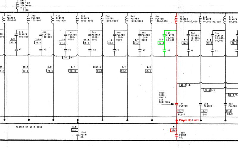 Volley Geschrieben 24. Januar 2015 Geschrieben 24. Januar 2015 Im Prinzip hast du Recht, aber die Player Unit verteilt die Steuersignale auf die 4 Spieler. Der Übertrag vom 1000er Zählwerk läuft über die Player Unit zum 10000er Zählwerk. Wegen Spieler 2-4 muss es prinzipiell OK sein, so das nur die Leitung vom Schleifer nach aussen als Fehlerquelle in Betracht kommt. Die ist (wegen der Verteilfunktion) für alle Spieler anders. Am "Eingangssignal" kann es nicht liegen, das funktioniert ja bei den anderen Spielern. Im Plan siehst Du den Pfad unten rechts. Geschaltet wird das 10000 er Zählwerl über einen Kontakt am 1000 Pt Relais (weisses Kabel). Von da aus geht das Signal auf die Player Up Unit. Bis dahin muss alles OK sein. Dann wird dort das Signal verteilt. Für Spieler 1 sollte es dann an einem blau-roten Kabel wieder herauskommen welches zum 9er Kontakt am 1000er Zählwerk von Spieler 1 geht. Hier kann das Kabel (blau-rot) an der Seite ab sein, aber auch das Kabel an der Player Unit vom Kontakt unter dem Spinnenarm zum Anschluss wo das blau-rote Kabelangelötet wird (Platinenrückseite!!!). Zum Testen kannst Du mit einem Kabel mit 2 Krokoklemmen einfach eine Brücke vom weissen zum blau-roten Kabel ziehen. Klappt der Übertrag dann liegt der Fehler an der Player Up Unit. Vom 9er-Kontakt am 1000er Zählwerk geht das Signal dann direkt auf das 10000er Zählwerk. Auch hier kann natürlich ein Kabelbruch vorliegen. Aus das könntest Du mit dem Kroko-Kabel checken. Beim Reset kommt das Signal über einen anderen Weg (grün)!