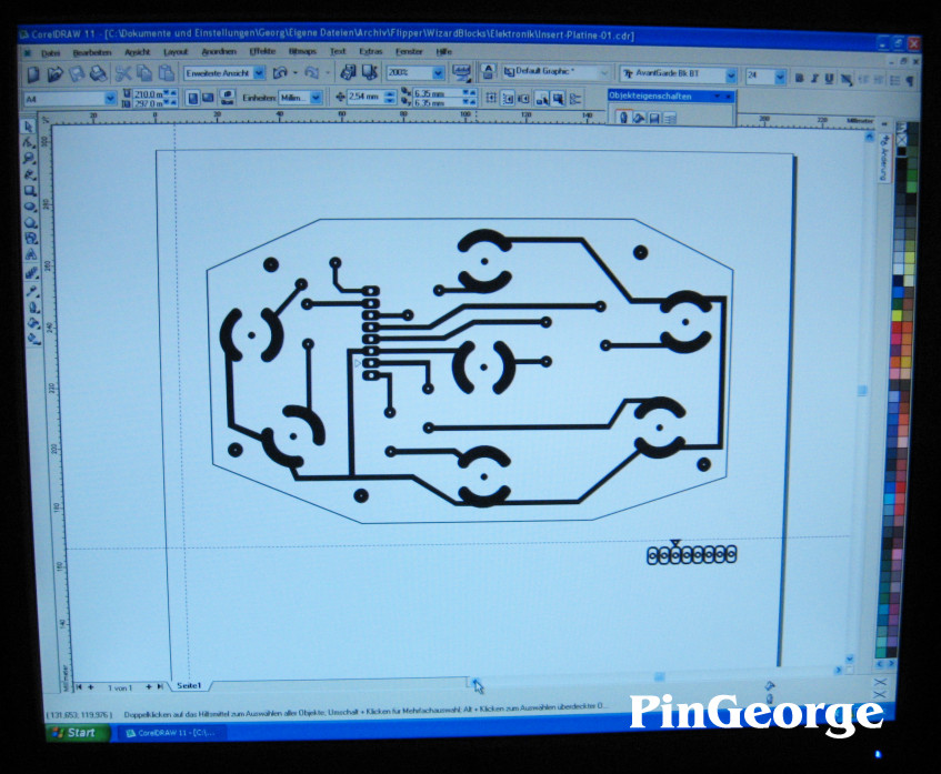 PinGeorge Geschrieben 3. Februar 2011 Autor Geschrieben 3. Februar 2011 In Arbeit sind nun die Beleuchtungsplatinen für die Inserts. Hierfür erstelle ich nun die Platinenlayouts was mit jedem normalen Grafik Programm erledigt werden kann. Morgen werden dann die Filme erstellt; die Platinen entwickelt und verzinnt; danach der Ätzvorgang sowie die Auftragung von Lötstopplack so das dann die Platinen gebohrt und bestückt werden können.