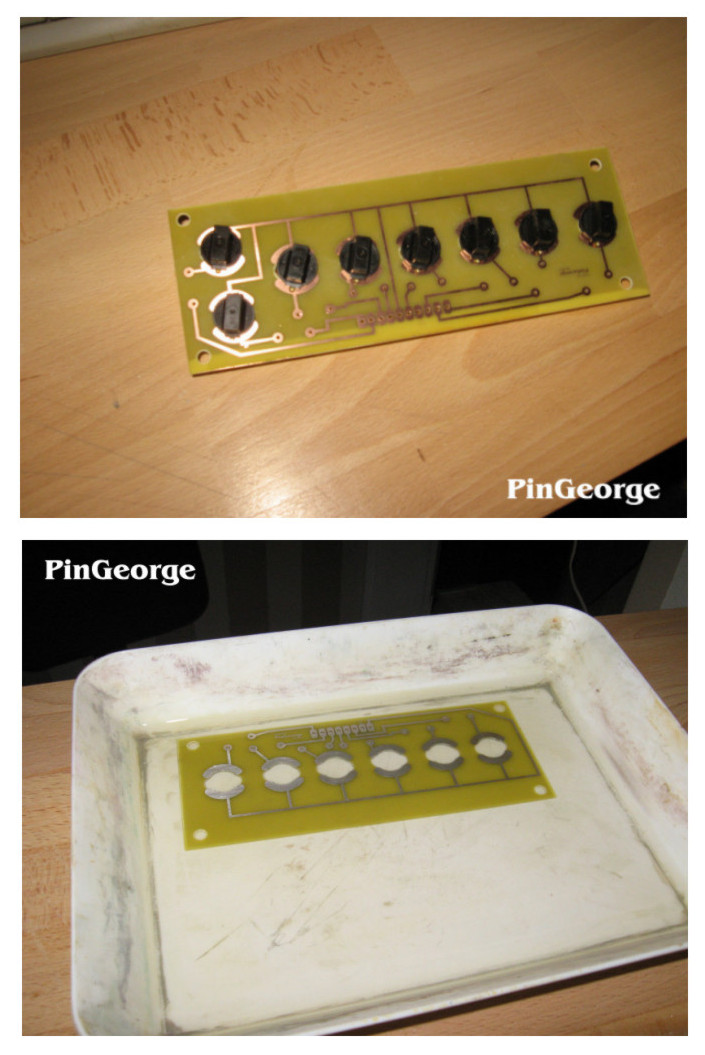 PinGeorge Geschrieben 5. Februar 2011 Autor Geschrieben 5. Februar 2011 Die Platinen sind nun fertig gebohrt und gefräst und haben zum Test die Lampensockel montiert bekommen. (Bild 1) Nun kommt der letzte chemische Behandlungsprozess; die Kupferbahnen werden verzinnt. Hierfür bleiben die Platinen zwei bis drei Stunden in der Arbeitsschale und können danach mit Lötstopplack versehen werden. (Bild 2)