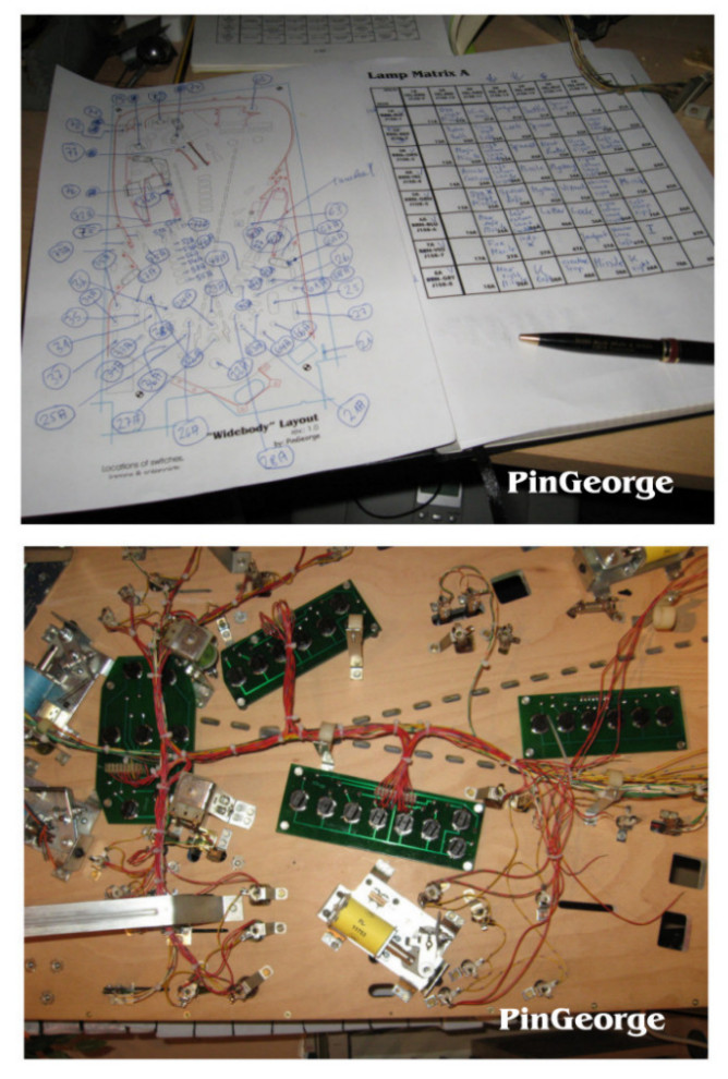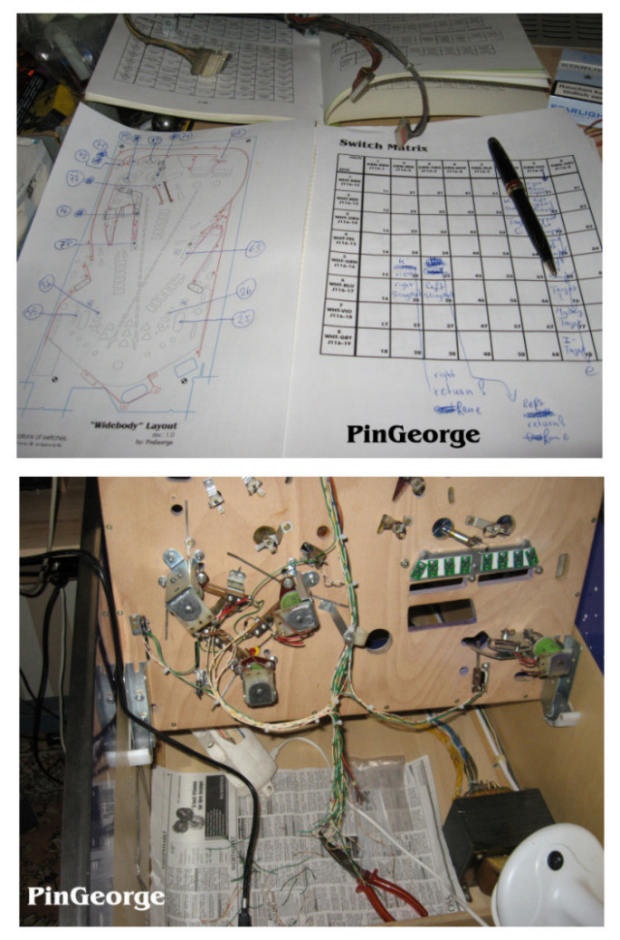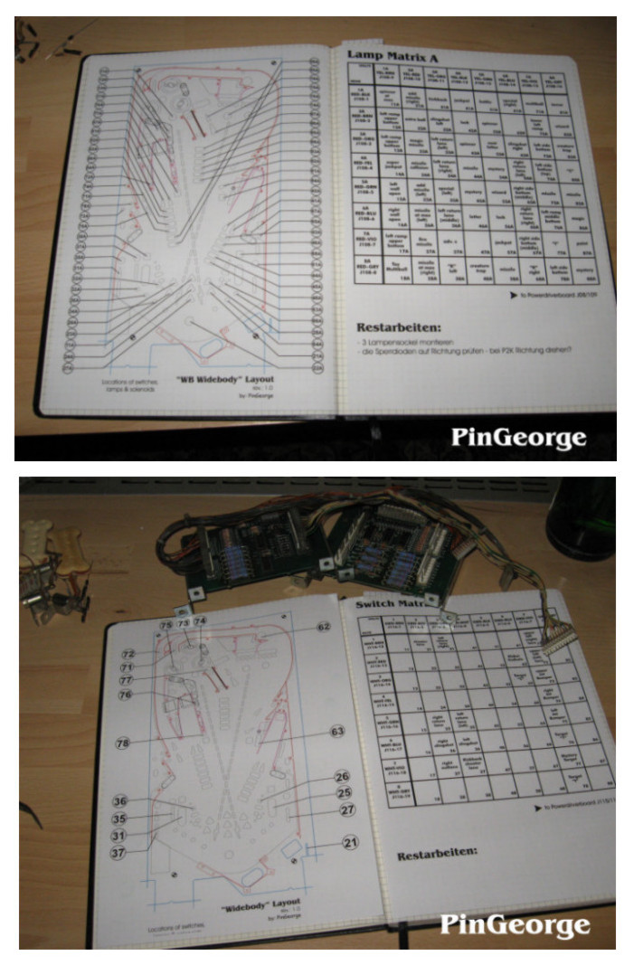 PinGeorge Geschrieben 8. Februar 2011 Autor Geschrieben 8. Februar 2011 Einige Tage wird es nun brauchen bis das alles was nun unter dem Spielfeld ist, verdrahtet und verlötet ist. Bild 1: Hier lege ich nun die genaue Dokumentation an wo was wie ist. Anhand der Spielfeldübersicht werden dann alle Verknüpfungen aus der Matrix Tabelle mit ihren entsprechenden Nummern eingetragen. So kann ich dann jeden Schalter per Nummer und Kabelfarbe verfolgen; falls später einmal Probleme vorhanden sind. Bild 2: Hier nun ein Teil der Switches die verlötet worden sind. Nachdem alle Kabel liegen wird es sofort per Kabelbinder verschnürt und glatt verlegt. Am unteren Spielfeldrand hängen dann die Kabel herunter wo dann die Steckerplatte eingebaut werden soll.