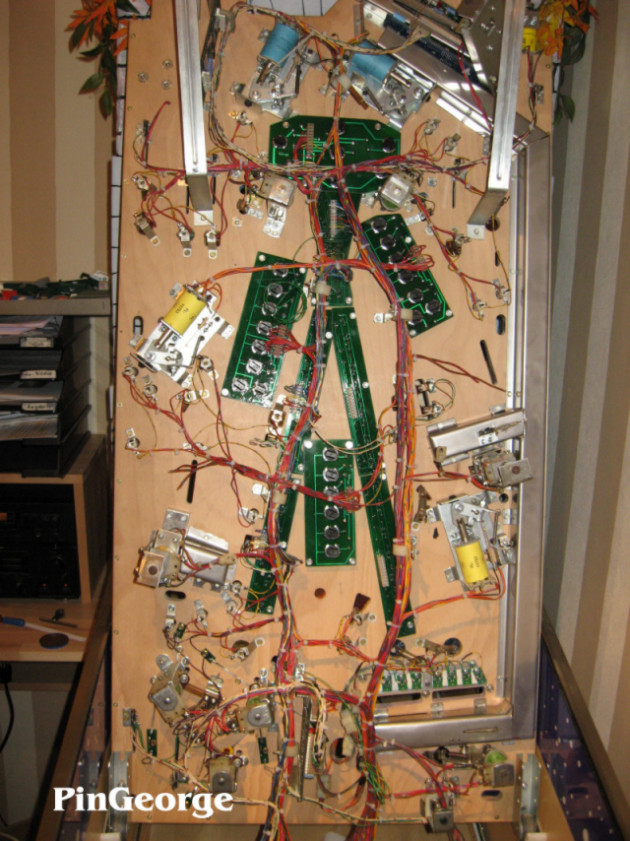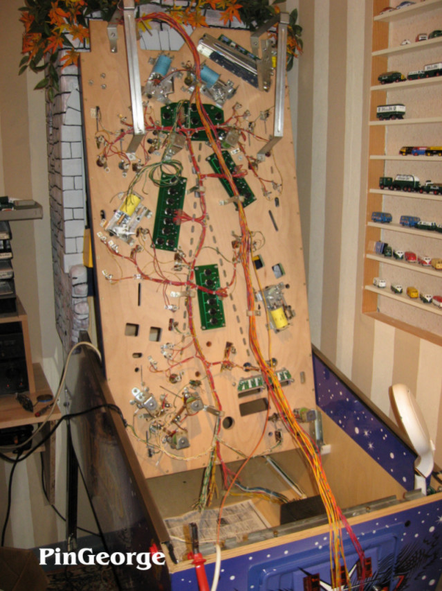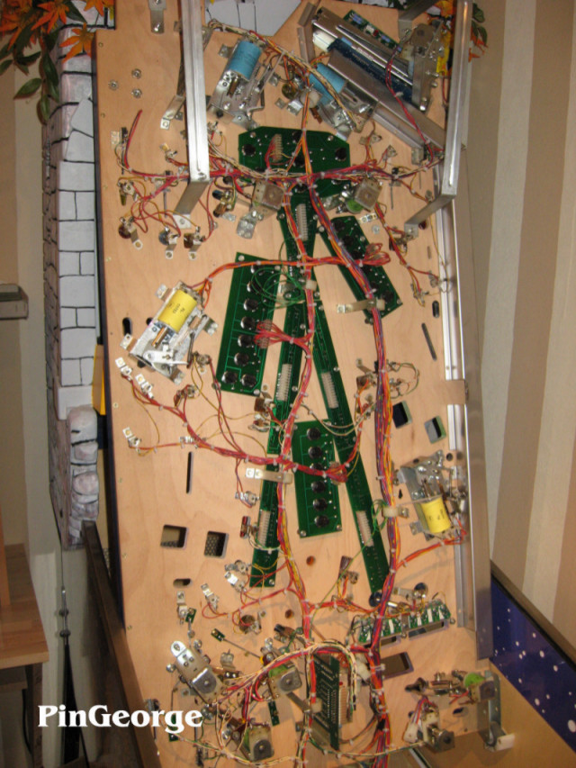 PinGeorge Geschrieben 29. Januar 2011 Autor Geschrieben 29. Januar 2011 Viele weitere Teile sind unter dem Spielfeld mittlerweile eingebaut worden; so nun auch der erste Kabelbaum für die "Lamp Matrix A". Es werden weitere Lamp Matrix verlegt werden; so wird es neben Matrix A noch B und C geben. Es kann sein das es erforderlich wird dies noch um Matrix D zu erweitern. Hierfür wird ein ganz neues Power Driver Board von mir gebaut da das bestehende aus den P2K Flippern nicht verwendet werden kann. In Kürze werden auch die Platinen für die Beleuchtungen unter den Inserts sowie den Missile Lines angefertigt.