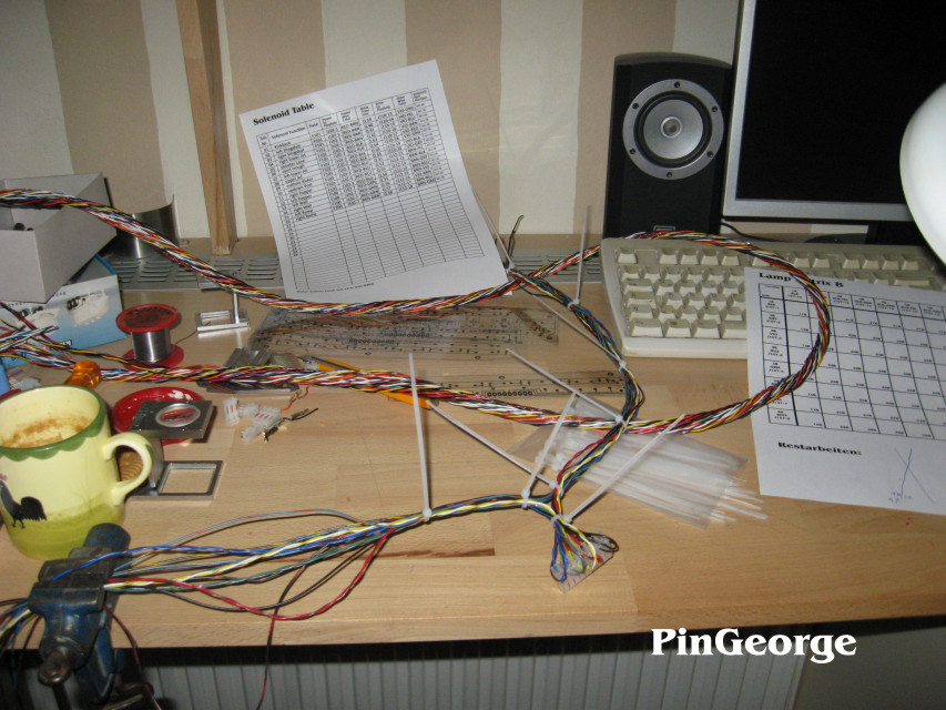 PinGeorge Geschrieben 7. März 2011 Autor Geschrieben 7. März 2011 Die rechten und linken Popper sowie die unterirdischen Lanes sind beinahe fertig; Bilder darüber folgen in Kürze. Nun mache ich einen neuen Kabelbaum für Lamp Matrix B und C; hierfür brauche ich neue Kabelfarben. So verwerte ich nun eine alte Datenleitung die aus 37 Einzelsträngen besteht; ein Datenkabel Typs LIYCY. Auf dem Bild zu sehen die Anfertigung des neuen Kabelbaumes; auch die Solenoids sind nun fertig verdrahtet und das Solenoid Table ist komplett bis auf die Flasher.