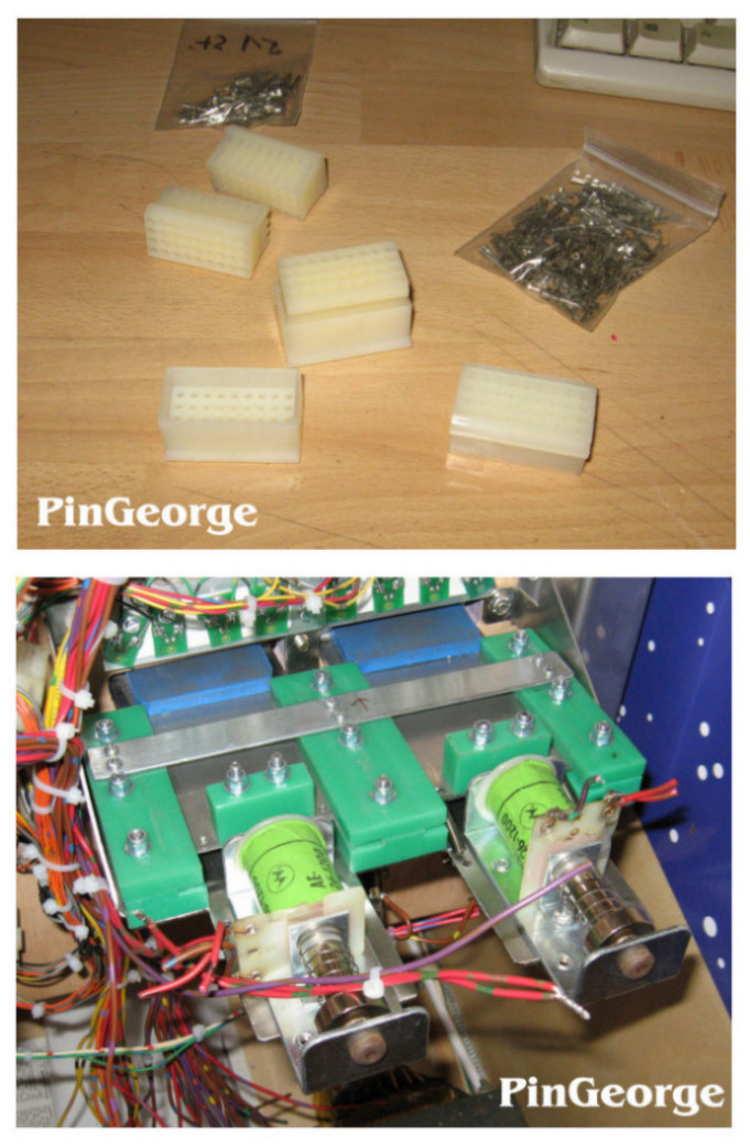 PinGeorge Geschrieben 24. März 2011 Autor Geschrieben 24. März 2011 Die Wall ist nun fast fertig; es fehlen lediglich die beiden kleinen Coils für die Raststufen; damit die Walls in der oberen Position gehalten werden. Diese montiere ich jedoch später. Nun werde ich erst den Multistecker am hinteren Ende des Spielfeldes herstellen; hier werden dann alle Kabel mit Steckern zusammengeführt. Später kann ich dann durch die hintere Wartungstür diese Stecker lösen - wenn das Spielfeld einmal für Wartungsarbeiten komplett herausgehoben werden soll. Also beginnt nun eine schöne Crimparbeit; denn jedes Kabel muss mit einem Stecker/Buchse versehen werden.