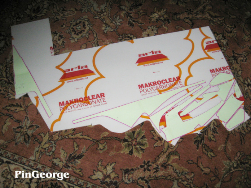 PinGeorge Geschrieben 17. April 2011 Autor Geschrieben 17. April 2011 Die Schablonen übertrage ich nun auf eine große Platte durchsichtigem Polycarbonat; die ich danach dann ausschneiden kann. Die Polycarbonat Platte dient als Grundplatte für die 3D Aufbauten.