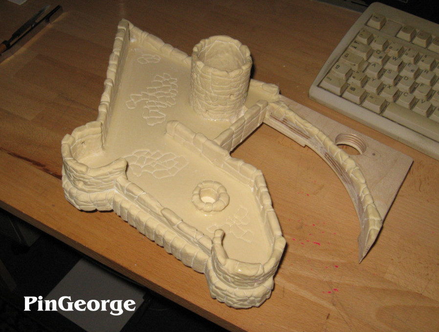 PinGeorge Geschrieben 21. April 2011 Autor Geschrieben 21. April 2011 Die offenen Stellen an den Plastics werden von unten bedruckt so das es ein komplettes Erscheinungsbild geben wird. Heute wurde die linke Seitenwand von der rechten Rampe fertig; hier sind an beiden Seiten Treppen die oberhalb dann noch eine Steinbrücke bekommen werden. Schlecht zu sehen im Moment; aber an der Seite wurde bereits ein erster Baumstamm mit eingraviert.