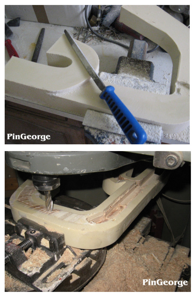 PinGeorge Geschrieben 7. Mai 2011 Autor Geschrieben 7. Mai 2011 Die geöffnete Form wird nun an der Unterseite glatt geschliffen; nicht zu glatt da ich auch auf der Unterseite das Steinmuster gravieren werde. Nun folgt der schwierigste Teil; der Holzkern muß herausgefräst werden ohne dabei die Polycarbonatstreifen zu beschädigen. Wenn es beschädigt wird muß ich einen neuen Streifen anfertigen und dann später einsetzen.