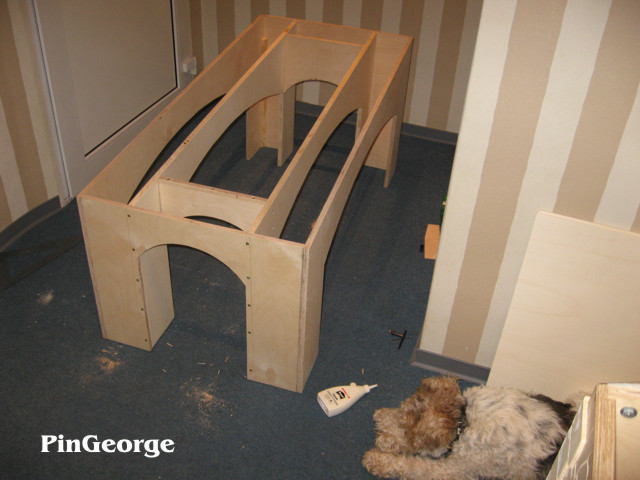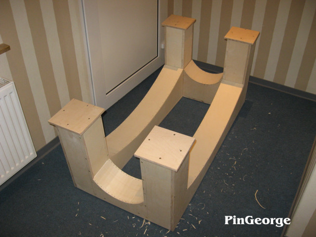 PinGeorge Geschrieben 4. Mai 2011 Autor Geschrieben 4. Mai 2011 (bearbeitet) Ja im Kopf habe ich das schon kalkuliert - und hier wird es an der kritischen Stelle auf jeden Fall noch eine Entschärfung bzw. eine Sicherheitsvorrichtung geben. Was grundsätzlicher viel dramatischer war konnte man an dem Prototypen sehen; die hatten mit Flugbällen zu kämpfen aufgrund der steilen Movable Ramps; die hatten nämlich hinter dem Knick schon eine Schutzplatte auf die Rampe montiert. Es wird mit Sicherheit noch Überraschungen geben woran ich jetzt noch gar nicht denke..... In Kanada, wo ich über meine Arbeiten auch berichte, wird dieses Thema mit großer Spannung und Aufmerksamkeit verfolgt. Nun beschäftige ich mich mit dem Bau der Steinrampen; die werden wohl eine Woche an Zeit brauchen bis sie fertig sind. Zuerst einmal übertrage ich mir von der Schablone die komplette Rampe auf eine dicke Platte Multiplex. Da ein Höhenunterschied von 5,3 bzw 6,5 cm überwuden werden muß; werden weitere Teilstücke ausgesägt. Bearbeitet 4. Mai 2011 von PinGeorge