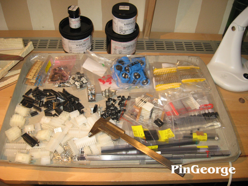 PinGeorge Geschrieben 27. April 2012 Autor Geschrieben 27. April 2012 Alle Teile sind nun da - bis auf einige wenige Kondensatoren die auf dem Weg sind. Während der Bestellung der Teile konnten einige Teile nicht mehr geliefert werden, so das dann hierfür Ersatz bestellt werden musste. Hierdurch muß ich nun schon wieder einiges an dem Layout ändern - es nimmt kein Ende. Großes Problem sind hierbei die Molex Header der Serie MLX, diese werden nun mit einer neuen Serie von Molex ersetzt. Im Bild die vielen Teile die bald eingelötet werden müssen. Im Hintergrund stehen schon die Farben für den Siebdruck; 2K Lötstopplack in rot und 2K Signierfarbe in weiß für die Beschriftung.