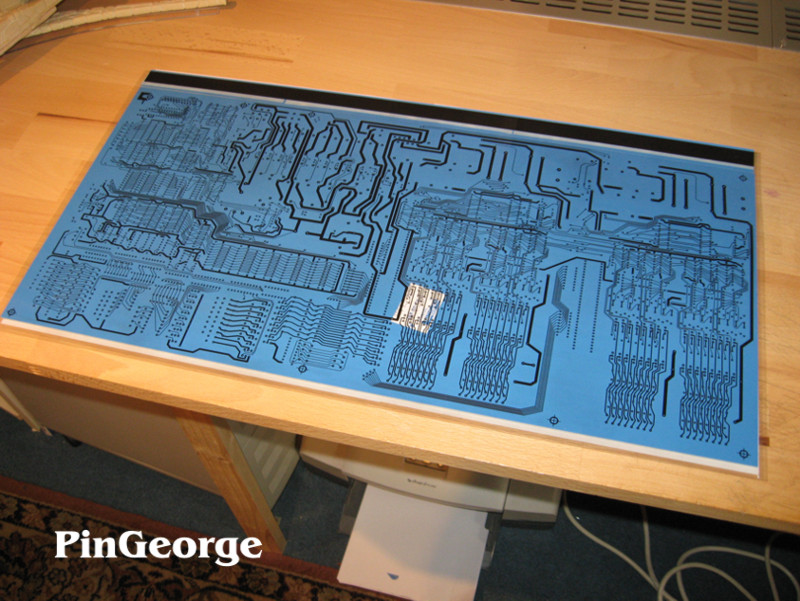 PinGeorge Geschrieben 23. Mai 2012 Autor Geschrieben 23. Mai 2012 Ja, die Fortschritte sind im Moment mühsam - denn immer wieder passieren kleine Fehler...... so musste ich einen Film neu erstellen und vorher noch Korrekturen machen. Es kamen einige dünne Leiterbahnen aneinander, und so verzögert sich dann alles wieder. Die Filme sind auf der Platine montiert, auf beiden Seiten. Zur exakten Ausrichtung wurden die Filme mittels der Passerkreuze genau zusammengelegt und dann an einem dünnen Streifen angeklebt, mittels doppelseitigem Klebeband. Dieser schmale Streifen befindet sich oberhalb der Platine. Nun kann das Board auf beiden Seiten, nachdem die blaue Schutzfolie entfernt wurde, auf einem größeren UV Vacuum Belichter belichtet werden.