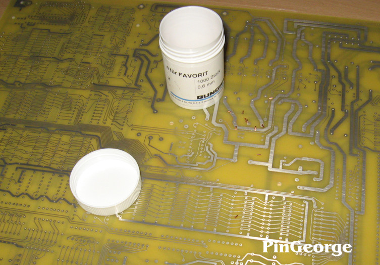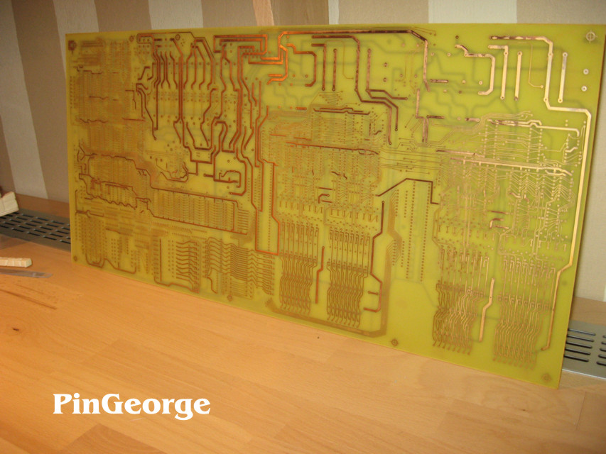 PinGeorge Geschrieben 9. Juni 2012 Autor Geschrieben 9. Juni 2012 (bearbeitet) Nachdem ich nun alle Löcher gebohrt habe, es waren mehr als 2500 Löcher konnte dann der Fotoresist der sich noch auf den Leiterbahnen befindet, gestrippt werden. Danach wurde das ganze Board dann mit einem feinen Schleifblock von den letzten Verunreinigungen befreit und danach chemisch verzinnt. Nun müssen viele Löcher noch mit Kontaktnieten aus Kupfer versehen werden. Das heisst das hier viele Leiterbahnen durchkontaktiert werden müssen. Vor allem die Löcher wo man später von vorne nichts einlöten kann wie die Kontaktstecker, große Kondensatoren, das Relais und andere Teile. P.S.: Ich bin mehrmals angefragt worden, warum es unter oder in einem Vacuum Belichter gemacht werden muß. Das geht auch mit einem Gerät mit Glasplatte, aber die Resultate werden unter Vacuum einfach besser, weil sich der Film wirklich ganz plan an die Platine ansaugt und es so zu keiner Unterstrahlung führen kann. Bei Unterstrahlungen werden (gerade) die dünnen Leiterbahnen unscharf und es könnte auch zu Kollisionen innerhalb der Leiterbahnen führen. Bearbeitet 9. Juni 2012 von PinGeorge