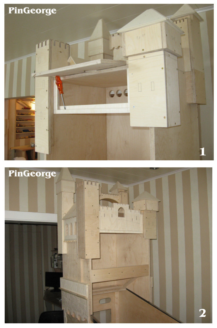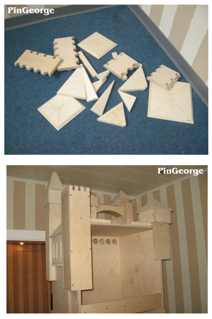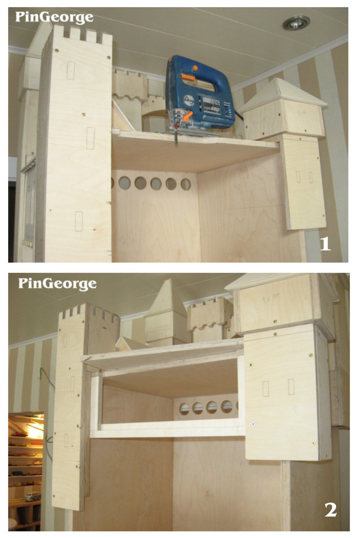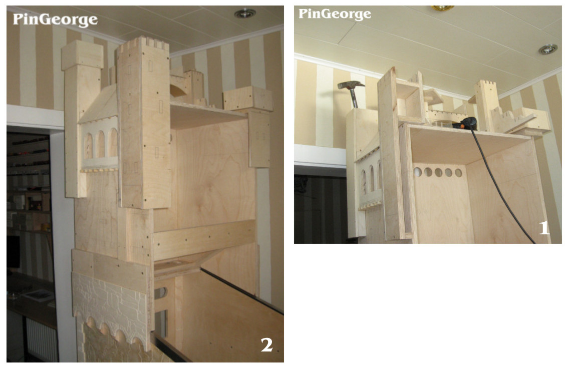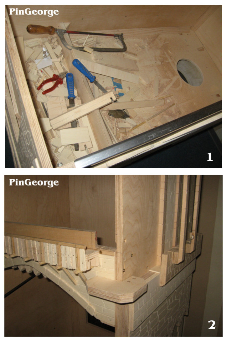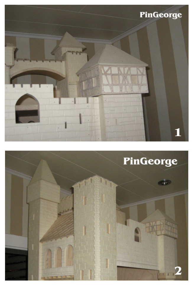 PinGeorge Geschrieben 3. Juli 2010 Autor Geschrieben 3. Juli 2010 Bild 1: Alle äusseren Mauern wurden mit gravierten Mauersteinplatten versehen, auch die vordere Klappe bekam Mauerplatten. Bild 2: Der hintere höchste Turm bekommt aussen an den Ecken kleine Türme aus gedrehtem massiven Buchenholz.